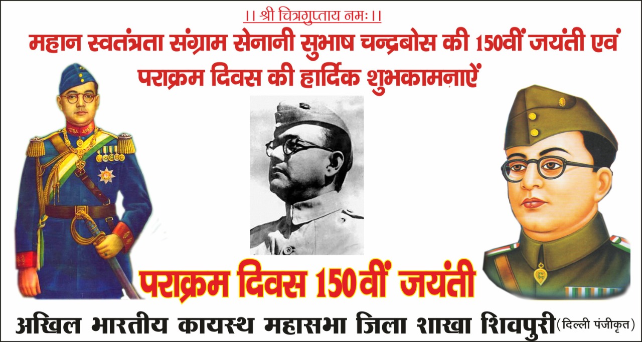 शिवपुरी-अखिल भातीय कायस्थ महासभा दिल्ली पंजी द्वारा आज 23 जन वरी 2021 को देश के महान स्वतत्रता संग्राम सेनानी सुभाष चन्द्र बोस की 150वी जयंती जिसे पूरा देश पराक्रम दिवस के रूप में मना रहा है सादगी पूर्ण रूप से मनाएगा। इस उपलक्ष्य में अखिल भारतीय कायस्थ महासभा द्वारा स्थानीय सुभाष चौक पुरानी शिवपुरी पर प्रात 10 बजे जयंती बनाए जाने का निर्णय लिया है जिसमे समाज के सभी चित्रांश बंधुओ से अधिक से अधिक संख्या में उपस्थति रहने का निवेदन किया है। इसके पश्चात इस पार्क के जीर्णोद्धार सौंदर्यीकरण एवं पार्क में नेताजी की आदमकद प्रतिमा की स्थापना हेतु माननीय जिलाधीश महोदय को समाज की ओर से ज्ञापन सौंपा जाएगा ताकि शहर के लोगों एवं आने वाली पीढयि़ों में इस महान विभूति की यादों को चिरस्थाई किया जा सके।